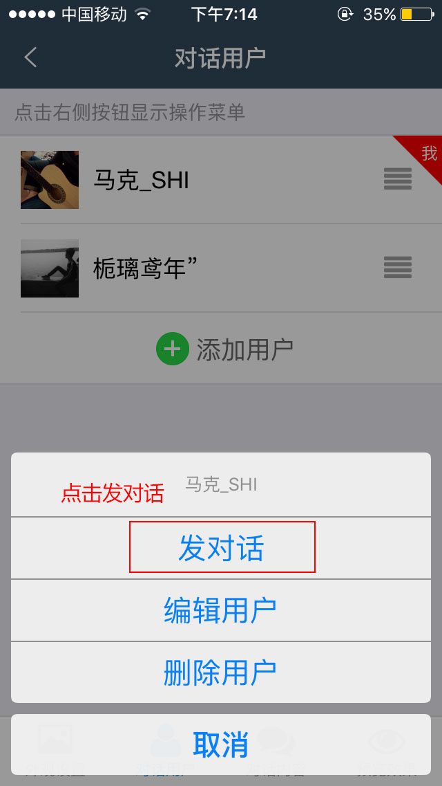 打开微信对话生成器,底部导航菜单选择“对话用户”